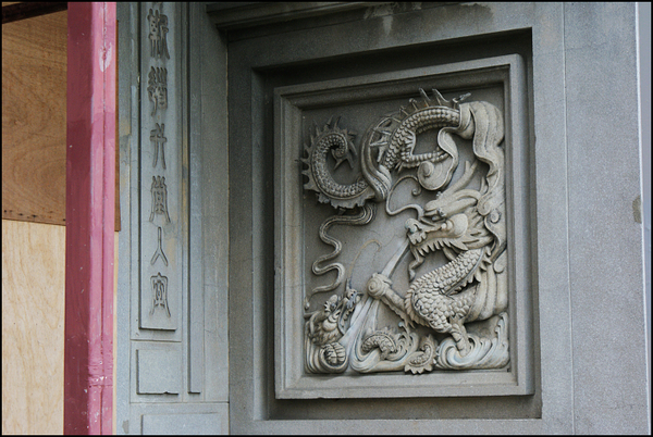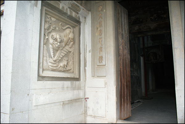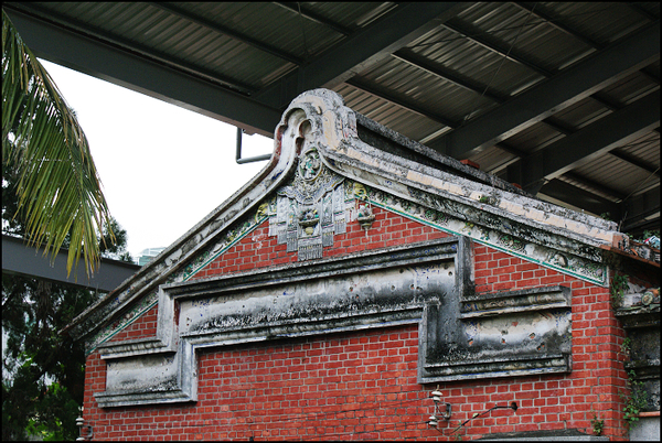背面塑「守身養志」,門額左右對稱裝飾可愛的天使,而左右的牆柱上則塑以雙獅對應,整體氣勢雄偉